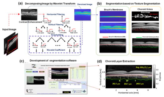 Schematic flow chart of the image-processing protocol from the B-scan image of an OCT scan. (a) Decomposing process based on wavelet transformation reduces image noise and enhances boundary layer visibility. (b) Segmentation process of BM and choroid layers. In particular, the binary image of the choroid layer texture is adopted to extract the choroid layer. (c) The algorithm of (a,b) are implemented to the guide user interface (GUI) using MATLAB software. The GUI is available to detect the retina, BM, and choroid layer and preserve the thickness of the choroid in three different locations (subfoveal, nasal, and temporal) and the average within the region of interest (ROI). (d) The automatically extracted results for the choroid layer.