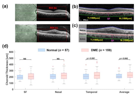 Additionally, choroid thickness in the same subgroups of patients was observed through automated image segmentation (Figure 4 and Figure 5). Figure 4a shows the B-scan samples of OCT, where the red box indicates the ROI. There, two examples illustrate the segmentation process using wavelet-based image processing with texture extraction. The results of the choroid thickness measurement were obtained in three locations at 500 μm intervals, from the nasal (N) to the temporal (T) to the subfoveal (SF), with an average thickness of the whole ROI. In Figure 4d, the choroid thickness at the SF location of both normal (197.17 ± 49.5 μm) and DME (206.46 ± 62.16 μm) groups was thicker than in other locations. The average choroid thickness in the DME group was greater than the normal group (229.07 ± 54.5 μm vs. 213.88 ± 45.6 μm; p = 0.062, Table 3 and Table 4).