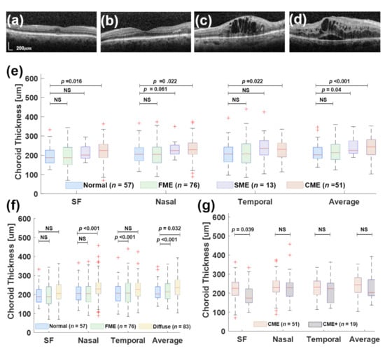 Measurement of choroidal thickness using the proposed in this work for segmentation of the retina and choroid layer. (a) Focal macular edema (FME). (b) Spongy macular edema (SME). (c) Cystic macular edema (CME). (d) CME with subretinal fluid (CME+). (e) Comparison of choroid thickness between normal, FME, SNE, and CME at different locations (SF, N, and T) and average choroid thickness. (f) Comparison of choroid thickness between normal and FME and Diffuse included SME and CME groups. (g) Comparison of choroid thickness between CME and CME+.