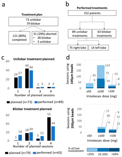 Technical considerations in terms of number of planned vs. performed treatment sessions and bead sizes and irinotecan doses used. Flowchart representing the number of planned uni- and bilobar tents, number of patients that did not complete the treatment plan (a). Flow chart representing the resulting number of performed uni- and bilobar treatments (b). The number of planned (dark blue) and actually performed (light blue) sessions per patients for uni- and bilobar treatment schedules (c). The number of sessions performed with 100 µm and 200 µm beads loaded with ≤50 mg, ≤100 mg and >100 mg irinotecan. The colours indicate the percentage of liver involvement from dark blue (>50%), medium blue (25–50%) and light blue (<25%) (d).