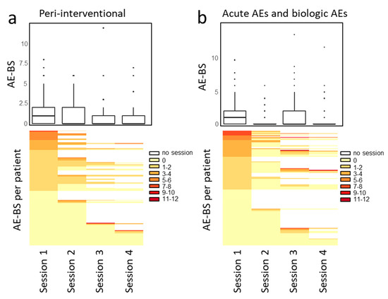 AE-BS per treatment session for peri-interventional (a) and acute and biologic AEs (b). The AE-BS represents the sum of all AE grades per patient. The boxplots show the AE-BS per treatment session for all patients and the heatmaps show the AE-BS per treatment session for each patient. Each row represents one patient. No clustering was used but the scores were sorted by descending AE-BS. White fields indicate no session was performed.