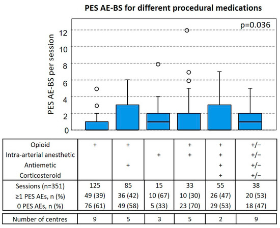 Sessions where only intra-arterial anesthetic was used caused ≥1 PES AEs most often (10/15; 67%) and had a median PES AE-BS of 1. Sessions where intra-arterial anesthetic together with opioids was used had the lowest occurrence of ≥1 PES AEs (10/30; 30%) and had a median PES AE-BS of 0. Opioids alone, opioids together with antiemetics, or all four groups combined were associated with similar frequencies of ≥1 PES AEs, 49/125 (39%), 36/85 (42%), and 26/55 (47%) and median AE-BS of 0. While we could not find significant differences in the proportion of ≥1 PES AEs between the groups, there were significant differences between median PES AE-BS across all groups (p = 0.036). Taking into account the heterogeneous data set and observational nature of the data collection, no post-hoc pair-wise comparison was performed. However, the groups were further analyzed to assess bias due to association with the factors that were previously identified to be connected with ≥1 PES AEs (Supplementary Table S3). While sessions performed with intra-arterial anesthetic without opioids (group 3) were associated with most of those factors, such as the use of 200-µm beads, only the percentage of liver involvement of 25–50% could be exclusively associated with group 3 (intra-arterial anesthetic without opioids).