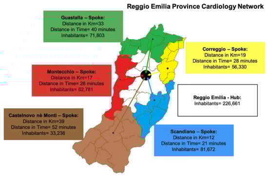 The cardiology network in Reggio Emilia. Six hospitals serve the Province of Reggio Emilia. Hospitals are organized according to their facilities: one invasive hub hospital with catheterisation laboratory (cath-lab) with 24/7 service (Reggio Emilia) and five non-invasive spoke hospitals (Guastalla and Castelnovo nè Monti, whose data are the object of the present study and Correggio, Scandiano, Montecchio). The distance between the spokes and the hub centres are expressed in km and time.