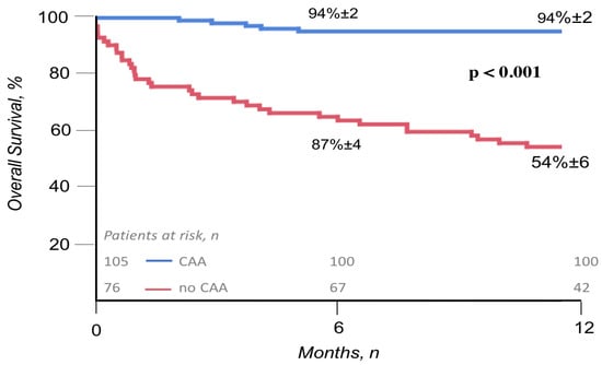 Overall 1-year survival after NSTEACS in patients treated with invasive strategy (blue line) and conservative strategy (red line). Figure legend: CAA (coronary artery angiography).