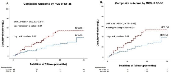 Cumulative incidence curves of the composite outcome stratified by (A) the physical component summary of the SF-36 and (B) the mental component summary of the SF-36 Health Survey. MCS, mental component summary; PCS, physical component summary; SF-36, 36-Item Short Form.