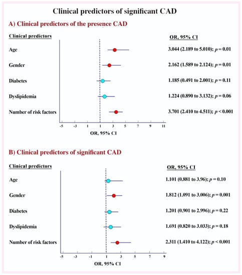 In univariate analysis, age (p = 0.002), female gender (p = 0.001), diabetes (p = 0.03), dyslipidemia (p = 0.001) and number of risk factors (p < 0.001) predicted the presence of CAD. In the multivariate model, only age (OR 3.044; 2.189 to 5.010; p = 0.01), female gender (OR 1.162; 1.589 to 2.124; p = 0.01) and number of cardiac risk factors (OR 3.701; 2.410 to 4.511; p < 0.001) predicted the presence of CAD (Figure 1A and Table S3). Similarly, in multivariate analysis, only the number of cardiac risk factors (OR 2.311; 1.610 to 4.122; p < 0.001) and female gender (OR 2.812; 1.601 to 4.006; p = 0.001) predicted significant CAD (Figure 1B and Table S4).