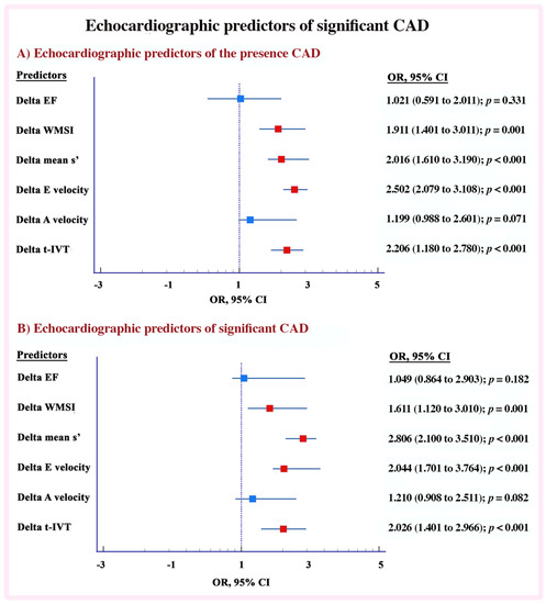 Echocardiographic predictors of significant CAD. (A) Echocardiographic predictors of the presence CAD. (B) Echocardiographic predictors of significant CAD.
