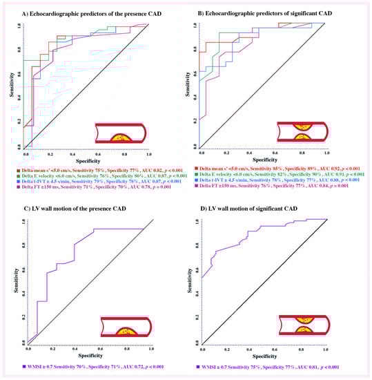 Identifying predictors of significant CAD shows the following: mean s’ < 5.0 cm/s was 85% sensitive and 89% specific with AUC of 0.92, p < 0.001; WMSI < 0.7 was 75% sensitive and 77% specific with AUC of 0.81, p < 0.001; Δ t-IVT ≥ 4.5 s/min was 78% sensitive and 77% specific with AUC of 0.88, p < 0.001; Δ FT ≥ 150 ms, 76% sensitive and 77% specific with AUC of 0.84, p < 0.001 and Δ E wave velocity < 6.0 cm/s, 82% sensitive and 90% specific with AUC of 0.91, p < 0.001 in predicting significant CAD (Figure 3B,D). Thus, the highest accurate predictors of significant CAD (with AUC ≥ 90%) were mean LV s’ < 5.0 cm/s and Δ E wave velocity < 6.0 cm/s.