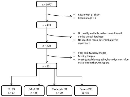 Flow chart of patient selection. BT = Blalock–Taussig, CMR = cardiovascular magnetic resonance, PR = pulmonary regurgitation.