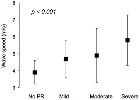 Significant differences were measured in terms of wave speed (Figure 3), which increased significantly with increasing PR (from 3.9 ± 0.7 m/s for the 0% PR group to 5.8 ± 1.5 m/s, p < 0.001, for the severe PR group). This reflects a significant reduction in aortic distensibility between the groups.