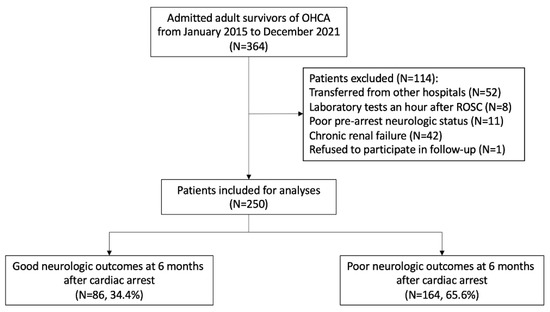 From January 2015 to December 2021, 364 adult OHCA patients were admitted to the ED of our hospital and received post-cardiac arrest care (Figure 1). Among these cases, 250 patients were finally included in our study after the exclusion of 114 patients who were transferred from other hospitals after the ROSC (n = 52), underwent laboratory tests an hour after ROSC (n = 8), had a poor pre-arrest neurological status (n = 11), had chronic renal failure (n = 42), or refused to follow-up (n = 1). A total of 164 patients (65.6%) in this cohort had a poor neurological outcome (CPC score ≥ 3) at 6 months after ROSC.