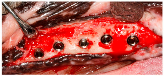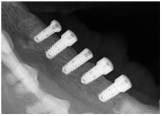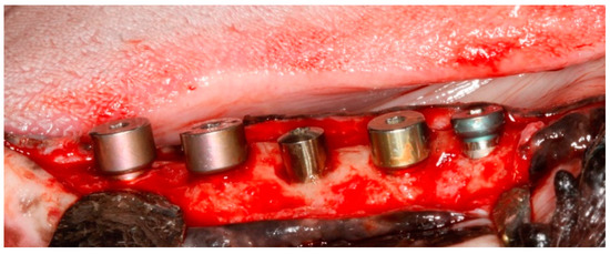 According to the timeline of the experiment (Figure 1), the premolars and the first molar were carefully extracted after reflection of full-thickness muco-periosteal flaps from the posterior mandibular region on the right side. The teeth were hemisected at the bifurcation using a tungsten carbide bur so that the roots could easily be removed using elevators and forcipes without damaging the bony walls. The wound margins were stabilized with a continuous suture and allowed to heal. Three months later, the five endosseous implants were inserted in the edentulous regions using standard instruments and surgical techniques. Following crestal incision, a full-thickness muco-periosteal flap was elevated to expose the site for implant placement. The interdental bone and any other bony prominences were trimmed with a large round bur and with Buser bone scrapers (HuFriedy, Chicago, IL, USA) to facilitate healing. The implant beds were drilled by standard drilling procedures, in accordance with the manufacturer’s instructions, under an abundant cooling stream of sterile 0,9% physiologic saline. The gradual widening of the implants site was obtained using a series of stainless-steel drills. The implants were placed in an increasing diameter mesio–distal order (implant No. 1 being the most mesial and implant No. 5 the most distal, adapted to the width of the residual edentulous crest), with the coating levels coinciding with the alveolar crest of the edentulous jaw region, with a minimum distance of at least 3 mm between them (Figure 2). Care was taken to align the implants as much as possible along the same sagittal plane, closer to the buccal aspect of the bone, in a prosthetic-driven position that simulates a real clinical situation. Parallelism was ensured by using dental implant parallel pins. The flaps were replaced above the submerged implants using 5-0 non-resorbable Polypropylene sutures (Perma Sharp, HuFriedy, Chicago, IL, USA). All procedures were carried out under the supervision of two veterinary surgeons, one of them in charge of the anesthetic procedures. Healing was evaluated weekly, and the dog was fed a soft diet for 14 days after the sutures were removed.
