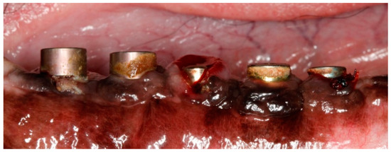 Implants were exposed 3 months post-implantation and their healing abutments were connected (Figure 3). The flaps were adjusted around the titanium abutments with interrupted sutures. No oral hygiene regimen was administrated during this period, so that the peri-implant inflammation could initiate spontaneously. Five months post-implantation (two months post implant exposure), to accelerate the progression of the initial lesions, cotton ligatures were placed according to the method described by Lindhe et al. [23] in a submarginal position around the neck of implant No. 1, two months later at implant No. 3 and, after another two months, at implant No. 5 (Figure 4). Two intermediate implants (No. 2 and No. 4) were left without ligatures. The ligatures were not replaced or removed during this experiment. The animal was then fed a soft diet to induce plaque accumulation and to provoke peri-implant inflammation and the loss of bone.
