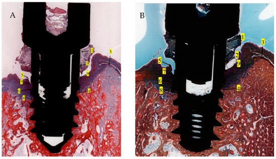 Histomorphometric landmarks identified on both buccal and lingual aspects in each implant: 1—implant shoulder (IS); 2—implant surface at the level of the bone crest (imp); 3—bone crest, defined as the most coronal point of the bone (BC); 4—bottom of the bone defect (BD); 5—margin of the peri-implant mucosa (PM); 6—the apical termination of the junctional epithelium (aJE); 7—the coronal level of the infiltrated connective tissue (cICT); 8—the apical extension of the infiltrated connective tissue (aICT); 9—the most apical extension of the submarginal biofilm that was interposed between the implant and the pocket epithelium of the peri-implant mucosa (aPlaque). (Implant #5, mirroring sections, (A)—Masson Goldner Anilin blue stain, (B)—Movat Pentachrome stain, original magnification ×2).