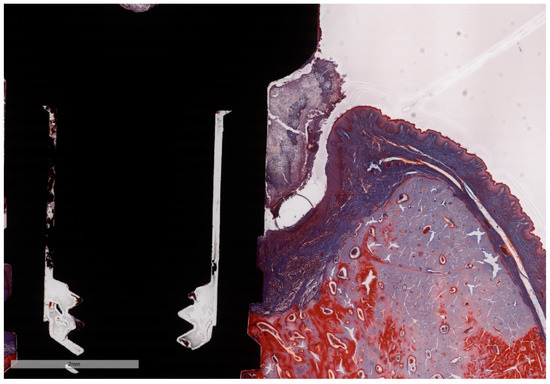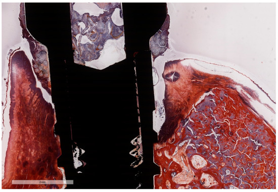 Technovit 9100 (Kulzer GmbH, Hanau, Germany) embedding resin was used for the infiltration and embedding steps. Sections were prepared using the cutting/grinding method described by Donath and Breuner [43] on a cutting/grinding system (Exakt, Norderstedt, Germany). A cut was performed in buccal–lingual direction through the middle of each implant on the long axis. For each implant, one section was carried out distally from the initial mid-section, while another section was carried out mesially, both on the long axis, so that two relatively equal central sections resulted. Each of these two sections were thinned and mechanically micro-polished, stepwise, using a Micro grinder machine (Exakt 400 CS, Norderstedt, Germany) reaching the final thickness of approximately 30 µm. For the staining of the sections, the deplastination of the thin-sections was performed by incubation in two baths of acetone and twice in methoxyethyl-acetate (MEA). One section of each implant sample (Section A) was stained with Masson Goldner Anilin blue (Morphisto, Frankfurt am Main, Germany) (MGA) and the other section (Section B, respectively) with MOVAT Pentachrome (after Verhöff) (Morphisto, Frankfurt am Main, Germany) (MOV). Finally, the stained slides were dehydrated and cover-slipped with mounting medium. MGA highlights the connective tissue (blue) with the differentiation of cytoplasm, muscle, erythrocytes and fibrin (red), as well as the staining of cell nuclei (black-brown), basal membranes (blue) and elastin (light red). MOV indicates collagen (light yellow) is differentiated from young osteoid (dark yellow) and osteon structures (reddish). Muscle tissue, cytoplasm and elastic fibers (red), as well as cell nuclei (blue-black) are shown differentiably.