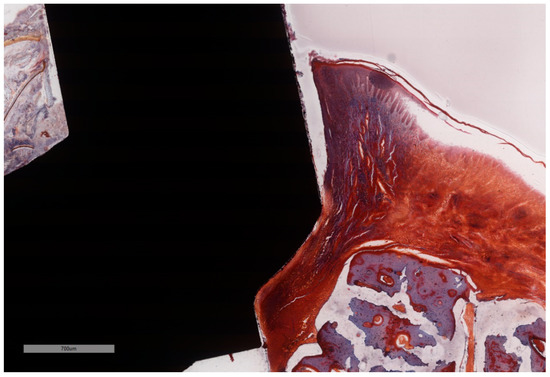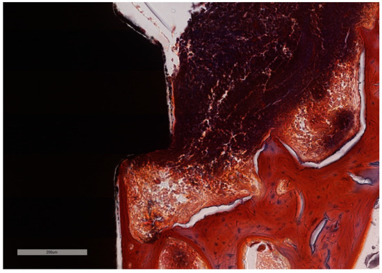 Bone in active phase of remodeling. ICT in simultaneous contact with the bone and with the implant surface with no squamous epithelium covering. Additionally, active bone remodeling is identified by the scalloped endosteal surface (Howship’s lacunae) (implant #1, MGA, bar measure is 200 µm).