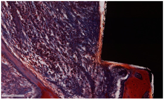 ICT in direct contact with the implant surface, without an interposed epithelial lining. Note the abundant lympho-plasmocytic infiltrate, which progresses inside the bone marrow, the thin bone trabeculae left after remodeling along with prominent osteoblast rim (implant #3, MGA, bar measure is 100 µm).