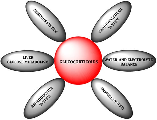 The precursor to the synthesis of GCs is cholesterol, which mainly comes from circulating low-density lipoproteins (LDL) in the plasma []. GCs are secreted by the cortex layer of the adrenal glands. The regulation of endogenous GC secretion takes place under the control of the hypothalamic–pituitary–adrenal axis (HPA) on the basis of negative feedback, and the main factor controlling cortisol secretion is adrenocorticotropic hormone (ACTH) []. By responding to a number of stimuli (physical, emotional and circadian), the hypothalamus activates the pathway that leads to the synthesis of GCs.
