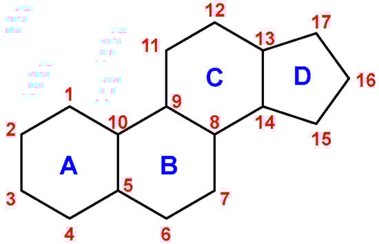 Glucocorticoids, the main representative of which in humans is cortisol (95% of glucocorticoid activity), play a significant role in the regulation of many physiological processes and ensure the maintenance of homeostasis in the body under stress (Figure 1) []. They play an important role in the metabolism of carbohydrates, fats and proteins. They take part in the regulation of water and electrolyte balance. They are responsible for the distribution of adipose tissue. They also affect the functioning of the central nervous system and the cardiovascular system. They take part in the regulation of immunological and inflammatory processes [,,,]. The structure of GCs is based on the hexadecahydro-1H-cyclopenta[a]phenanthrene ring, also known as the “steroid nucleus”, which is the basic structure of androgens, estrogens and progestins [] (Figure 2).