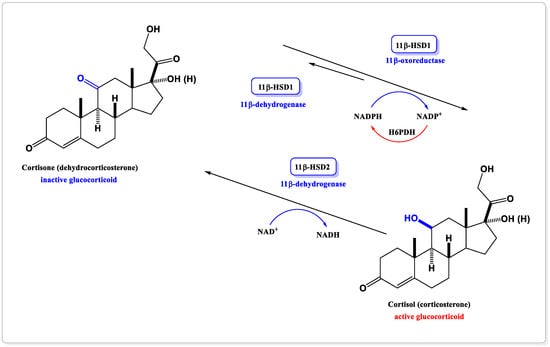 11β-hydroxysteroid dehydrogenase belongs to the short-chain family of NAD- or NADP-dependent dehydrogenases/reductases (SDRs) [,]. At the end of the 1990s, two isoforms of this enzyme, 11β-HSD1 and 11β-HSD2, were described []. Two isozymes of 11β-hydroxysteroid dehydrogenase catalyze the interconversion between inactive glucocorticoids (human cortisone and rodent 11-dehydrocorticosterone) and hormonally active glucocorticoids (human cortisol and rodent corticosterone) (Figure 3). The biological activity of the glucocorticoid molecule is regulated by enzymatic modification of the substituent at the C11 position. These transformations include oxidation and reduction reactions within the cortisol/corticosterone hydroxyl group and the cortisone/dehydrocorticosterone carbonyl group, respectively [,].