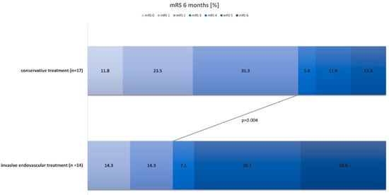 Clinical outcome after 6 months was better in patients treated conservatively compared to patients in the invasive endovascular treatment group (mRs 2 ± 1.5 vs. 4 ± 1.8, p = 0.004, Figure 2).