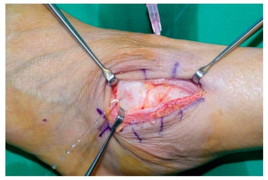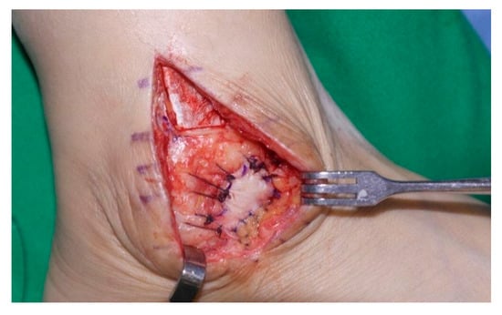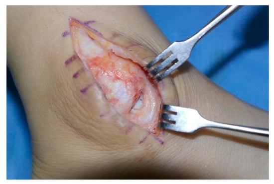 According to operative findings, the lateral joint capsule was ruptured in all cases, and a joint capsule defect was observed in 20 cases (Figure 4). Surgeries were performed in the following manner. In all cases, the ruptured joint capsule was repaired. In 20 cases, the repair site was reinforced using a fibular periosteal flap (Figure 5) and in one case using a peroneal fascia flap (Figure 6). Of the three patients with severe ankle instability, two patients underwent the Chrisman–Snook procedure and one patient underwent anatomical ligament reconstruction using an allograft tendon. Reverse sural artery flap was performed in two patients with severe soft tissue defects.