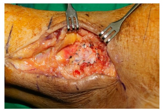 - Zhu, F.; Ning, J.L.; Li, X.J.; Zhang, L.; Zuo, Z.B. Application of modified peroneal tendofascial compound flap with partial tendon of peroneal long muscle in lower leg refractory defects with Achilles tendon rupture. Zhonghua Zheng Xing Wai Ke Za Zhi 2010, 26, 107–109. [Google Scholar] [PubMed]