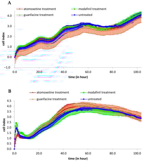 The proliferation measurements of MG63 and hMSC after administration of modafinil, atomoxetine and guanfacine for a period of four days showed no effect compared to the untreated control (Figure 1A,B). Maximum proliferation of MG63 showed a cell index of 4.0 cell after 100 h of incubation. Instead, the proliferation of treated and untreated hMSC achieved a cell index of 4.0 after an incubation period of 46 h.