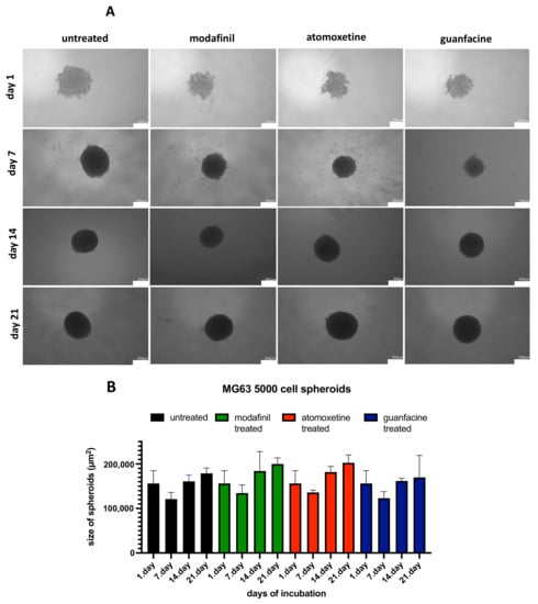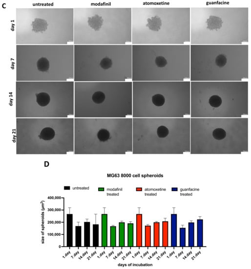 On the 21st day of incubation, untreated MG63 spheroids obtained with a starting cell count of 5000 and 8000 showed no significant difference in terms of spheroid size compared to modafinil-, atomoxetine- and guanfacine-treated MG63 spheroids (Figure 2A–D).