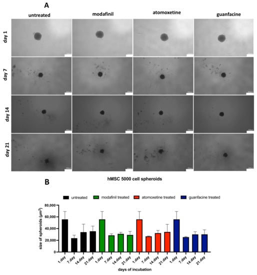 Cultivation of hMSC and MG63 spheroids was performed with 5000 and 8000 cells each on 1.5% agarose in a flat 96-well plate for 21 days. First, the 96-well plates were incubated on an orbital shaker with a shaking speed of 40 rpm for 12–18 h under cell culture conditions. The change of medium was performed at two-day intervals with the addition of modafinil (11.2 µg/mL), atomoxetine (0.9 µg/mL) and guanfacine (17.7 ng/mL).