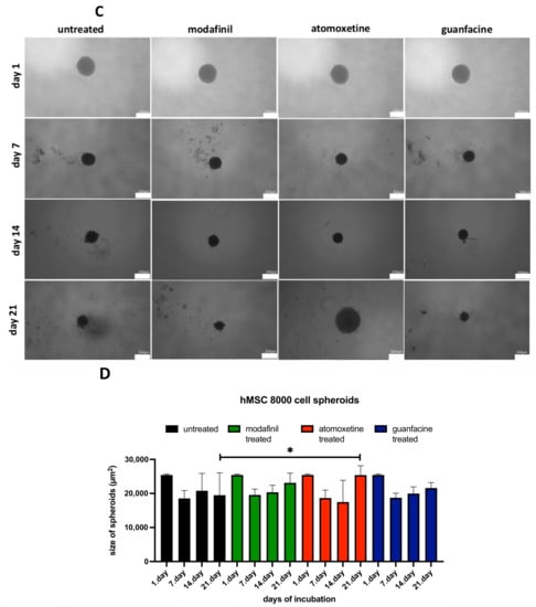 The effect of starting cell number under administration of untreated modafinil. (11.2 μg/mL), atomoxetine (0.9 µg/mL) and guanfacine (17.7 ng/mL) on spheroid size and morphology of hMSC (5000 cells) (A,B) and hMSC (8000 cells) (C,D). Spheroids were cultured for 21 days. Phase-contrast images of spheroids were taken at day 7, 14 and 21. Shown are means of spheroid size ± SD of three independent experiments with six biological replicates. Densitometric quantification of spheroid size was calculated by ImageJ software. Significance in difference between the groups was determined by ANOVA followed by Tukey’s post hoc test. Scale bar 250 µm. * corresponds to a value of p < 0.05.