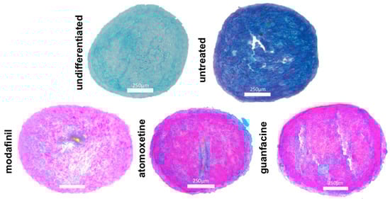 Untreated chondrogenic differentiated spheroids showed blue stained acidic mucopolysaccharides, dark blue collagenous fibres and reddish appearing nuclei on day 21 after Alcian blue nuclear red staining (Figure 4). Chondrogenic differentiated spheroids (day 21) showed predominantly faint pink stained cytoplasm, pink stained nuclei and a very small amount of blue stained acidic mucopolysaccharides after the administration of modafinil (Figure 4) after Alcian blue nuclear red staining. Atomoxetine- and guanfacine treated chondrogenic spheroids (Figure 4) demonstrated a predominantly pink coloured cytoplasm with pink to red coloured nuclei, analogous to modafinil-treated chondrocyte spheroids. Alcian blue-stained acidic mucopolysaccharides occupied a slightly larger spheroid fraction compared to modafinil-treated spheroids.