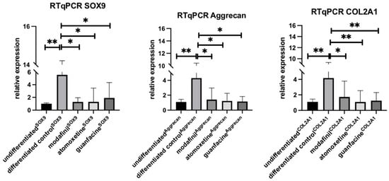 Expression of SOX9, Aggrecan and COL2A1 transcripts was determined in untreated, modafinil- (11.2 μg/mL), atomoxetine- (0.9 µg/mL) and guanfacine- (17.7 ng/mL) treated chondrogenic spheroids. Shown are means of normalized expression ± SD of three independent experiments with six biological replicates. The GAPDH transcript level was used to normalize the expression of the target genes. Significance in difference between the groups was determined by ANOVA followed by Tukey’s post hoc test. * corresponds to a value of p < 0.05. ** corresponds to a value of p < 0.01.