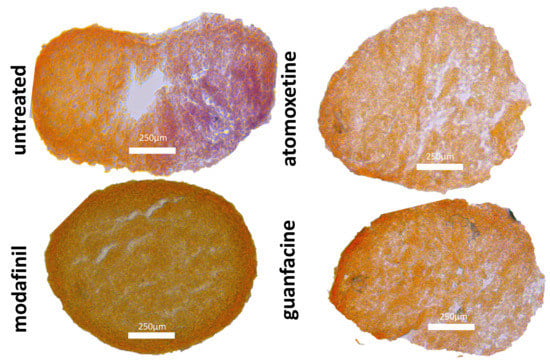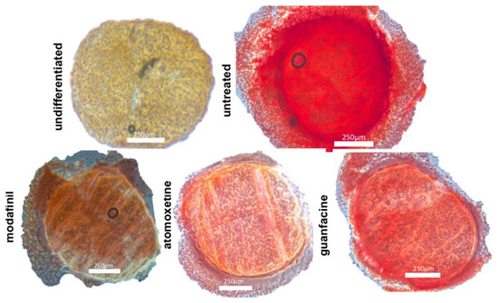 Untreated hMSC spheroids showed homogenous and intense bone-specific alizarin red staining, indicative of calcium deposition. The entire spheroid surface was strongly stained after 28 days of osteogenic differentiation (Figure 6). Atomoxetine- and guanfacine-treated hMSC spheroids displayed significantly attenuated alizarin red staining over the entire spheroid surface after 28 days of osteogenic differentiation (Figure 6). HMSC spheroids demonstrated a partially brown-stained spheroid surface after the administration of modafinil (Figure 6).