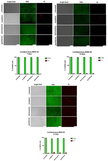 Cell viability assay of MG63-monolayer, using a live/dead staining with FDA. (green, live cells) and PI (red, dead cells). Images represent 7, 14 and 21-day-old monolayer MG63 of untreated, modafinil- (11.2 μg/mL), atomoxetine- (0.9 µg/mL) and guanfacine- (17.7 ng/mL) treated cells. Shown are three independent experiments with six biological replicates. Densitometric quantification of viable (green) and nonviable (red) cells was calculated by ImageJ software. Significance in difference between the groups was determined by ANOVA followed by Tukey’s post hoc test. Scale bar 150 µm.