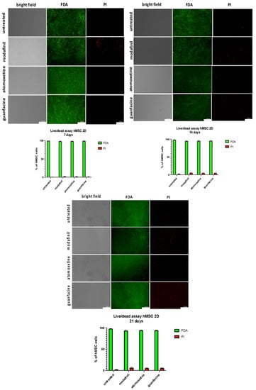 Cell viability assay of hMSC-monolayer, using a live/dead staining with FDA. (green, live cells) and PI (red, dead cells). Images represent 7, 14 and 21-day-old monolayer hMSC of untreated, modafinil- (11.2 μg/mL), atomoxetine- (0.9 µg/mL) and guanfacine- (17.7 ng/mL) treated cells. Shown are three independent experiments with six biological replicates. Densitometric quantification of viable (green) and nonviable (red) cells was calculated by ImageJ software. Significance in difference between the groups was determined by ANOVA followed by Tukey’s post hoc test. Scale bar 150 µm.