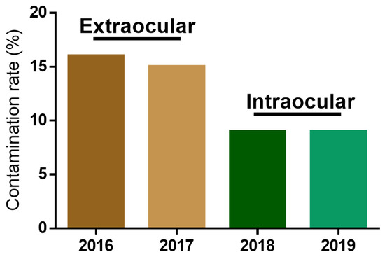 Corneal graft contamination rates in 2016–2019. Microbial sampling was performed at the extraocular side of the corneoscleral rim from 2016 to 2017 and at the intraocular side of the corneoscleral rim from 2018 to 2019. The corneal graft contamination rates were: 16.15% in 2016, 14.87% in 2017, 7.96% in 2018, and 8.63% in 2019.