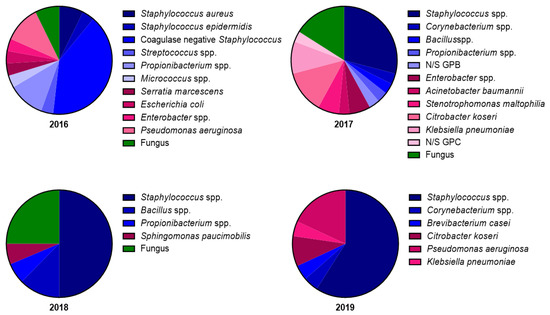 Composition statistics of microbial strains in cases positive for microbial contamination. We identified 11 and 12 microbial strains in 2016 and 2017, respectively, from the extraocular side of corneoscleral rim sampling. We identified 5 and 6 microbial strains in 2018 and 2019, respectively, from the intraocular side of corneoscleral rim sampling. N/S, non-specific; GPB, Gram-positive bacillus; GNC, Gram-negative cocci.