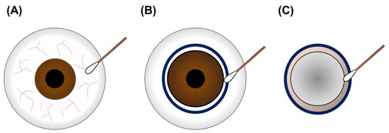 Microbial sampling sites in this study. All microbial sampling was performed using a sterile cotton swab, and the samples were preserved in autoclaved lysogeny broth. (A) Pre-surgery microbial samples were collected from the conjunctiva of the ocular surface. Post-surgery samples were collected from the extraocular corneal limbus (B) and intraocular corneoscleral rim (C) for surgical contamination analysis.