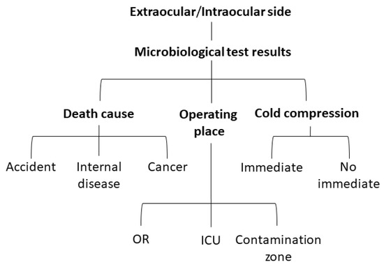 According to the statistical results of previous graft contamination, we evaluated 30 corneal grafts to compare the microbial sampling sites and donor-associated factors. Corneal donors were collected from subjects from central and southern Taiwan who had no infectious diseases, according to the NEBT policies. We examined the ocular surface commensals before surgery, contaminating microbes at the extraocular side of the corneoscleral rim, and contaminating microbes at the extraocular side of the corneoscleral rim (Figure 3). Pre-surgery microbial sampling was performed to determine the true- or false-negative microbial test results in post-surgery sampling. The post-surgery sampling results were compared for consistency. The contamination rate of the extraocular and intraocular sides of the corneoscleral rim was further analyzed to determine the influence of donor-associated factors. The compared factors included: death caused by an accident (subarachnoid hemorrhage, subdural hematoma, intracerebral hemorrhage, and intraventricular hemorrhage); internal disease (chronic pulmonary embolism, acute myocardial infarction, and cerebrovascular accident); cancer (rectal cancer, lung cancer, tongue cancer, pancreatic tail adenocarcinoma, sigmoid adenocarcinoma, and esophageal cancer); operation in the operating room, intensive care unit, or contamination zone (ward or emergency room); and immediate cold compression (Figure 4). Donor-associated factors were compared in order to exclude factors interfering with the graft contamination results.
