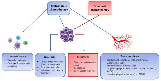 Metronomic chemotherapy (MC) is the frequent, regular administration of drug doses designed to maintain a low, but active, range of concentrations of chemotherapeutic drugs, during prolonged periods of time without inducing excessive toxicities. MC regimens were developed to optimize the antitumor efficacy of cytotoxic agents, thus avoiding recurrent issues of standard maximum tolerated dose (MTD) chemotherapy [1]. MC acts through different mechanisms, depending on doses and schedules: the inhibition of tumor angiogenesis with a privileged activity against endothelial cells [2,3]; induction of tumor dormancy [4]; direct cytotoxic effect on cancer stem cells [5]; activation of anticancer immune response by depletion of T regulatory (Treg) cells [6] (Figure 1).
