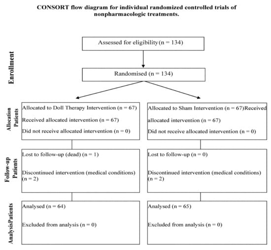 - Santagata, F.; Massaia, M.; D’Amelio, P. The Doll Therapy as a First Line Treatment for Behavioral and Psychologic Symptoms of Dementia in Nursing Homes Residents: A Randomized, Controlled Study. BMC Geriatr. 2021, 21, 545. [Google Scholar] [CrossRef] [PubMed]