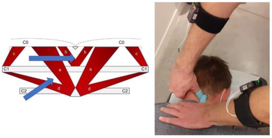 Schematic presentation of the suboccipital muscles (left) and demonstration of the stretch of the rectus capitis posterior (right). Blue arrows represent directions of the applied stretch on the rectus capitis posterior (a) and the obliquus capitis inferior (d). Moreover, represented: rectus capitis posterior minor (b) and obliquus capitis superior (c).