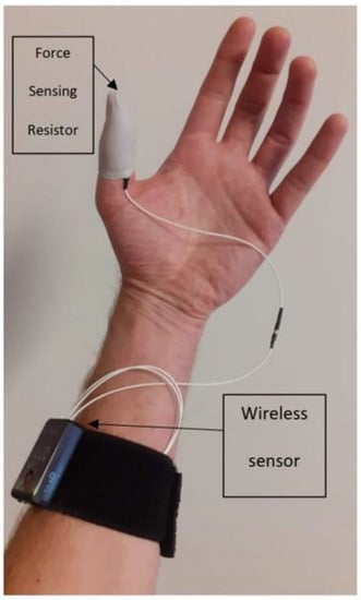 Experimental setup with the location of the force sensing resistor (FSR) sensors on the top of the thumb.