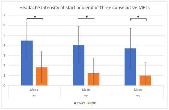 Headache intensity (numerical pain rating score, 0–10) at the start and end of each of the three consecutive trials (T1, T2, T3). MPTs = Manual Pressure Techniques * = p < 0.001 (paired T-test).