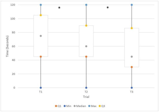 Time (seconds) needed to obtain a reduction of the referred head pain in three consecutive trials (T1, T2, T3). *: significant difference (Wilcoxon signed-rank test).