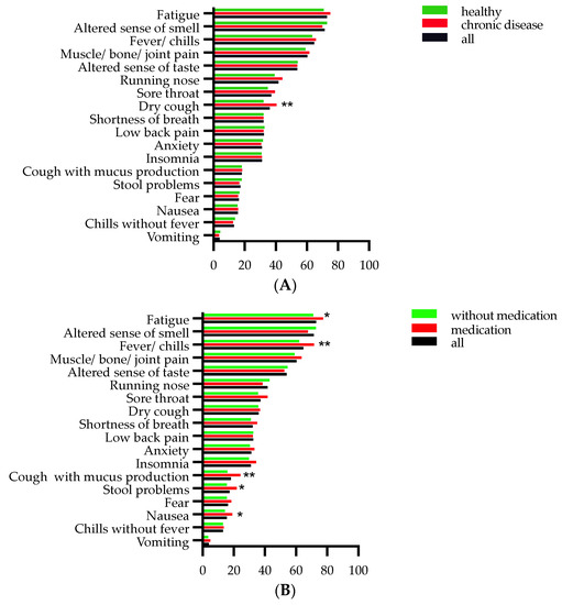 Acute symptoms in 1050 participants. Panel (A) presents percentages of healthy participants (green) and with chronic disease (red) reporting any acute symptoms prior to acute infection. Panel (B) presents percentages of participants without (green) and with medication (red) prior to acute infection. Statistically significant differences are indicated between healthy and with chronic disease (panel (A)) and between participants with and without medication (panel (B)) prior to acute infection. * p < 0.05 and ** p < 0.01 (Chi-square test).
