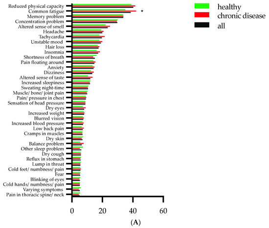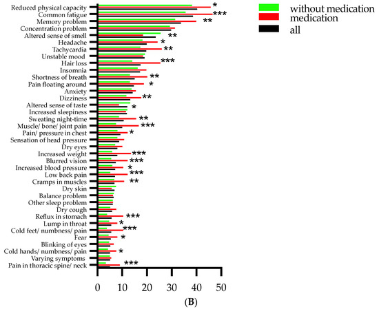 Persistent symptoms in 1050 participants. Panel (A) presents percentages of healthy participants (green) and with chronic disease (red) reporting any persistent symptom. Panel (B) presents percentages of participants without (green) and with medication (red) reporting any persistent symptom. Statistically significant differences are indicated between healthy and with chronic disease (panel (A)) and between participants with and without medication (panel (B)) prior to acute infection. * p < 0.05, ** p < 0.01, and *** p < 0.001 (Chi-square test).
