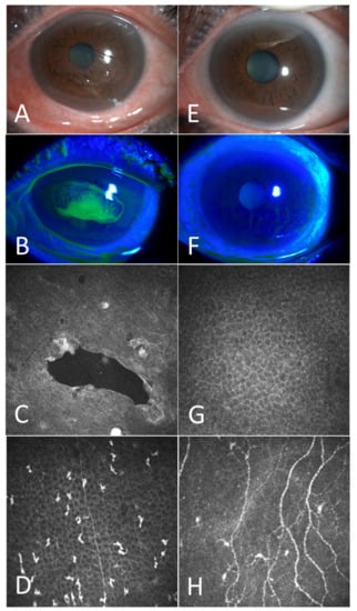 - Hernández-Quintela, E.; Mayer, F.; Dighiero, P.; Briat, B.; Savoldelli, M.; Legeais, J.-M.; Renard, G. Confocal microscopy of cystic disorders of the corneal epithelium. Ophthalmology 1998, 105, 631–636. [Google Scholar] [CrossRef]
