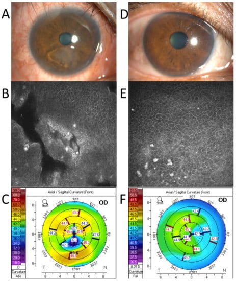 Patient 2. A 62-year-old man with two months of trauma. The preoperative examination revealed a large area of loose corneal epithelium (Figure 2A,B). The IVCM revealed a clearly loose corneal epithelium. Corneal topography showed 7.5 D astigmatism (Figure 2C). One month after the surgery, the cornea had healed completely (Figure 2D), the loose area had disappeared (Figure 2E), and the corneal astigmatism had decreased to 0.9 D (Figure 2F).